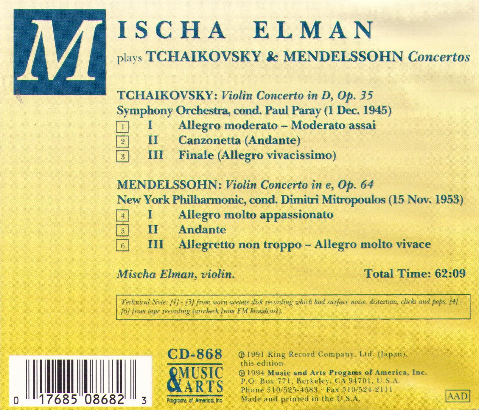 MISCHA ELMAN -Tchaikovsky-Mendelssohn-1-CD-868 live performances 1945 & 1953
