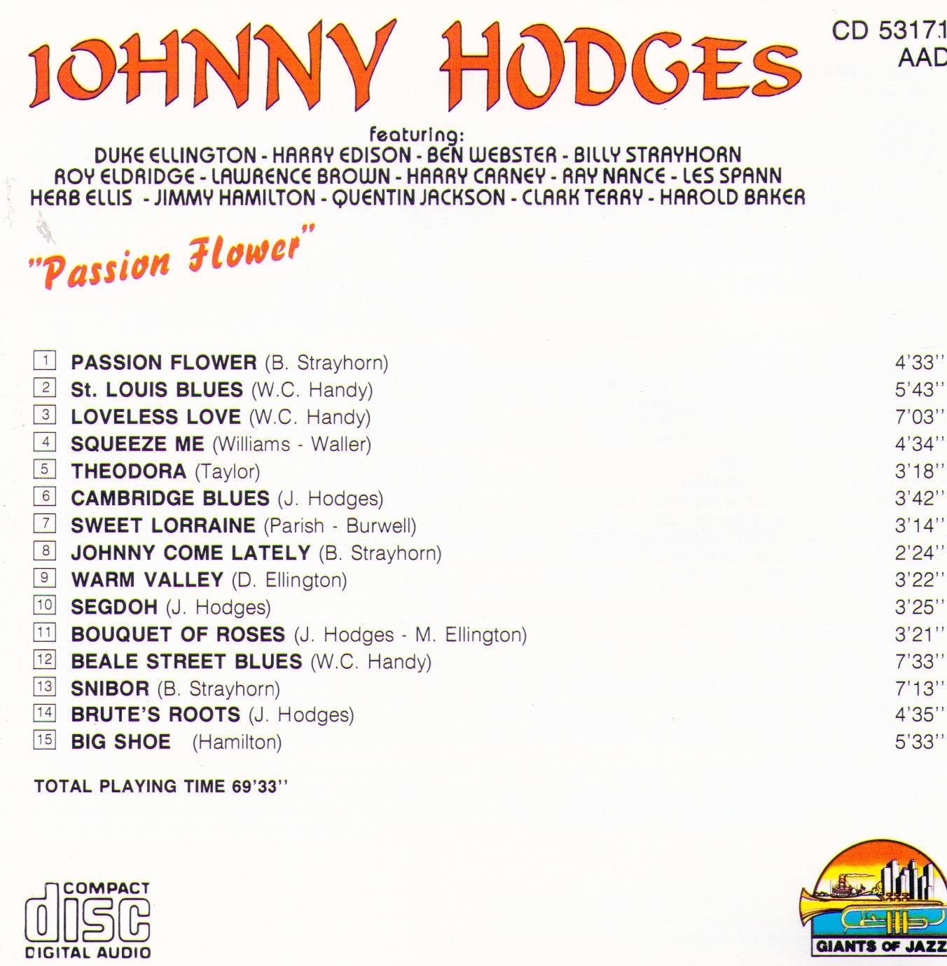 JOHNNY HODGES "Passion Flower" - CD 53171 featuring Duke Ellington; Harry Edison; Ben Webster; Billy Strayhorn; Roy Eldridge; Lawrence Brown; Harry Carney; Ray Nance; Les Spann; Herb Ellis; Jimmy Hamilton; Quentin Jackson; Clark Terry; Harold Baker.