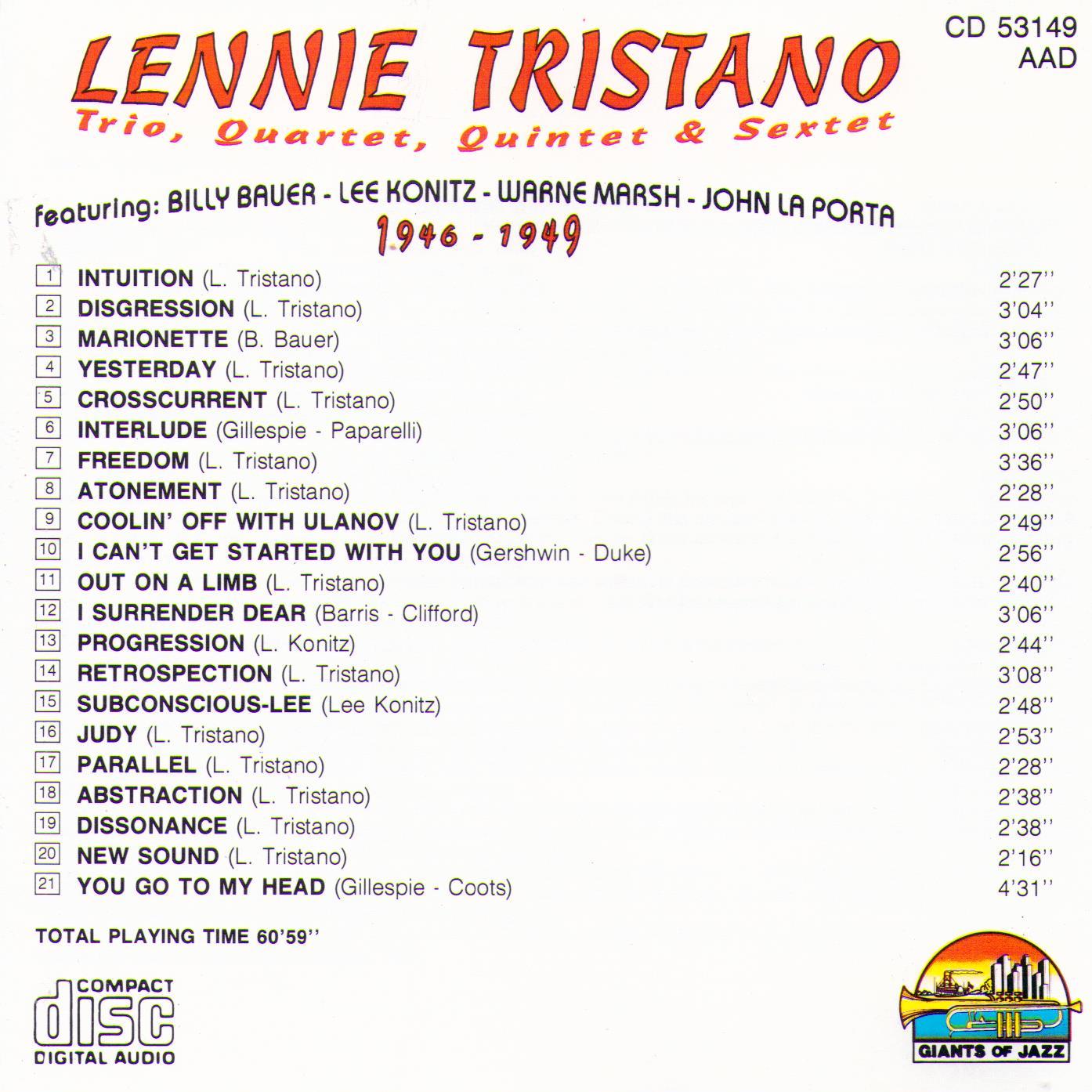 LENNIE TRISTANO Trio, Quartet, Quintet & Sextet - 1946-1949 - CD 53149 featuring Billy Bauer; Lee Konitz; Warne Marsh; John La Porta