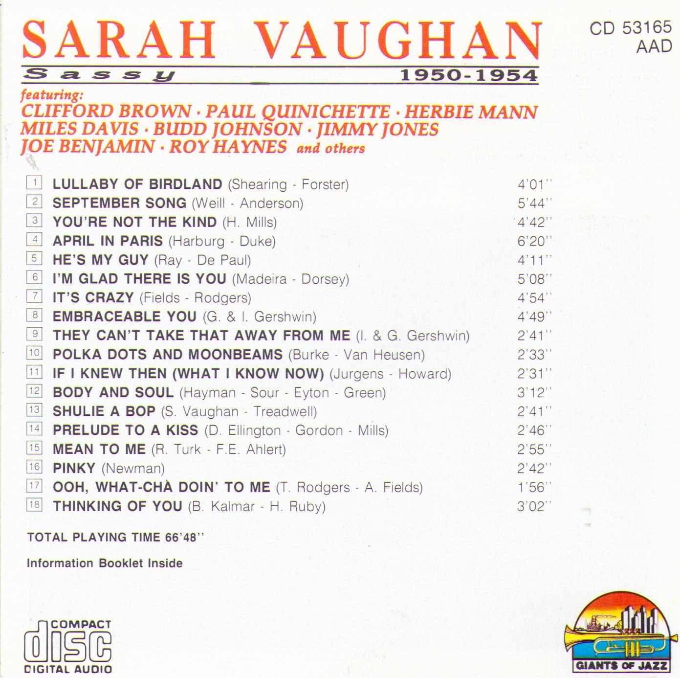 SASSY VAUGHAN "Sassy" - 1950-1954 - CD 53165 featuring Clifford Brown; Paul Quinichette; Herbie Mann; Miles Davis; Budd Johnson; Jimmy Jones; Joe Benjamin; Roy Haynes and others.