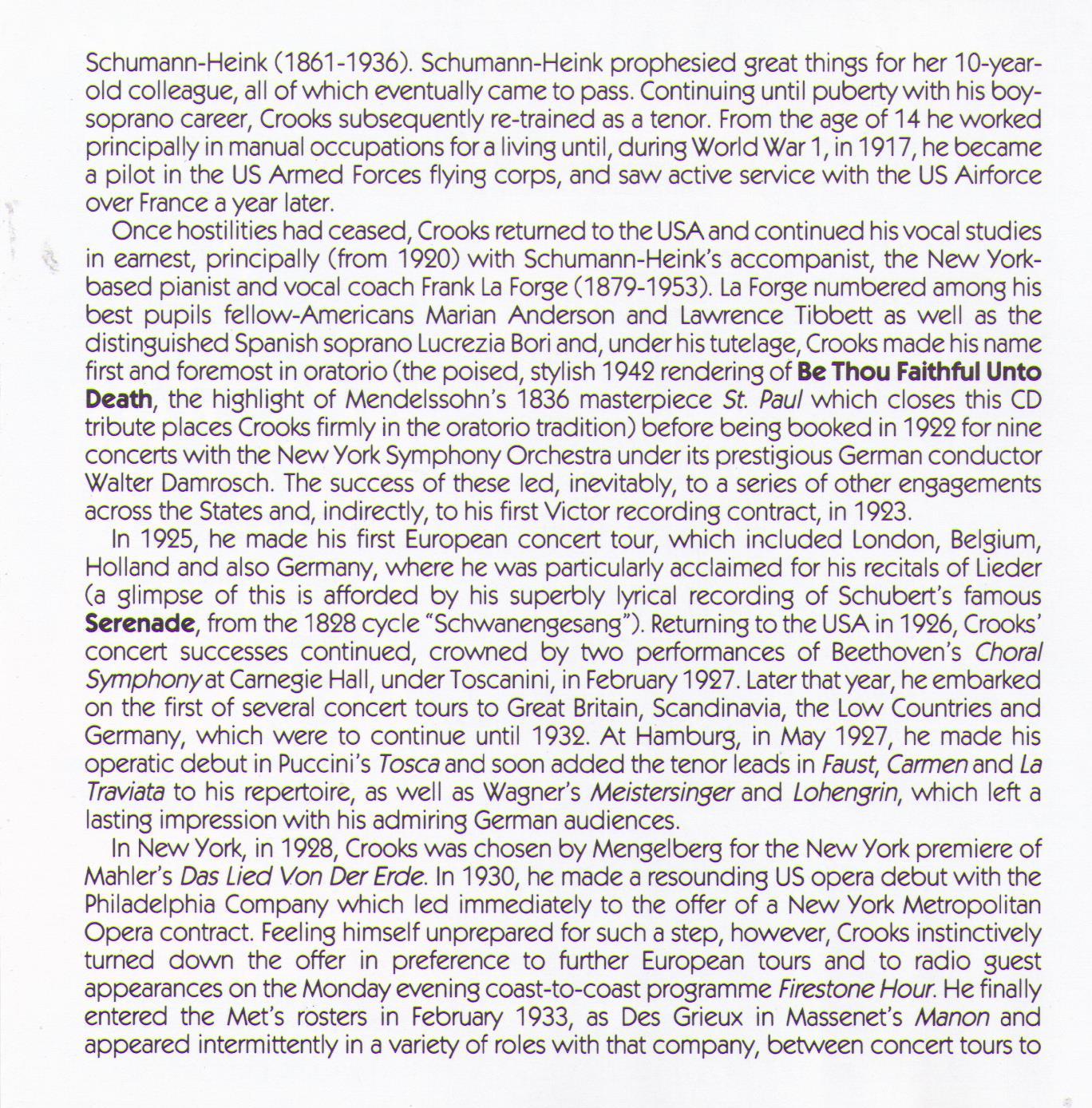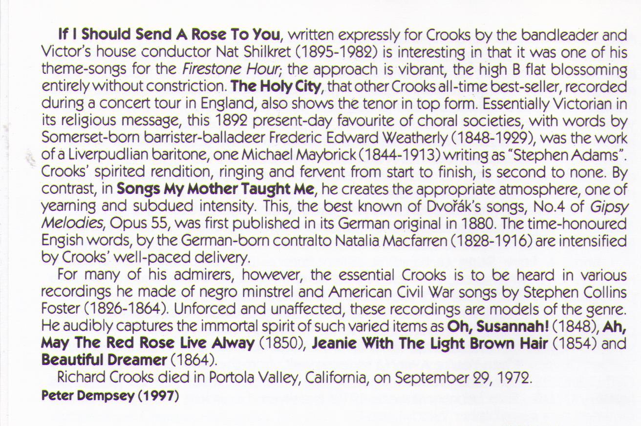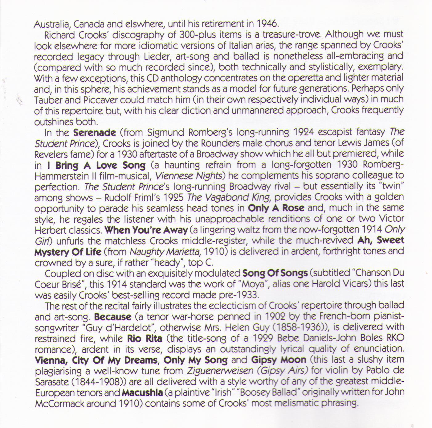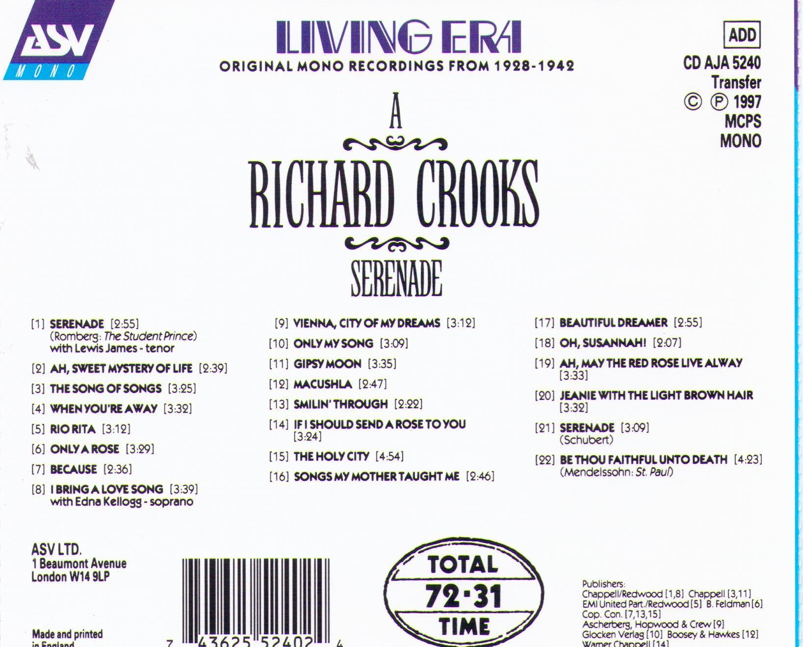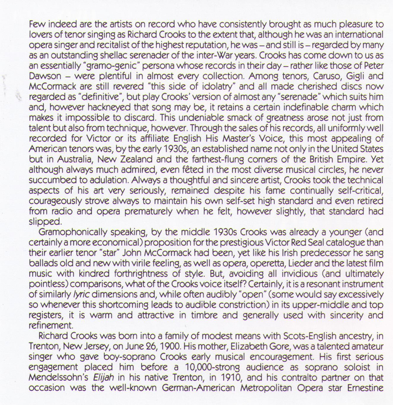 Few indeed are the artists on record who have consistently brought as much pleasure to lovers of tenor singing as Richard Crooks to the extent that, although he was an international opera singer and recitalist of the highest reputation, he was---and still is---regarded by many as an outstanding shellac serenader of the inter-War years.