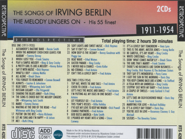 The Songs of IRVING BERLIN ' The Melody Lingers On' RTS 4287 - 2-CD Set