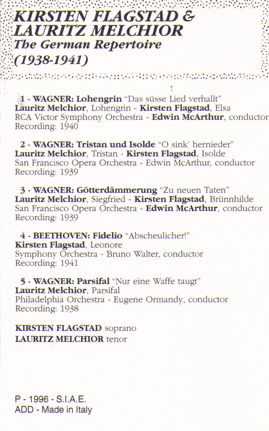 FLAGSTAD & Melchior - The German Repertoire - VA 1128 KIRSTEN FLAGSTAD:- Flagstad did not attain international stardom until she was in her forties, but when she did her success was immediate and astonishing and she was soon recognised as one of the greatest Wagnerian sopranos of all time. LAURITZ MELCHIOR:- An ideal Heldentenor with his baritonal volume and timbre, and his strong ringing high notes, Melchior was probably the greatest Wagner tenor of this century, and one of the few to pay meticulous attention to the beauty of sound, purity of emission and precision of pronunciation.