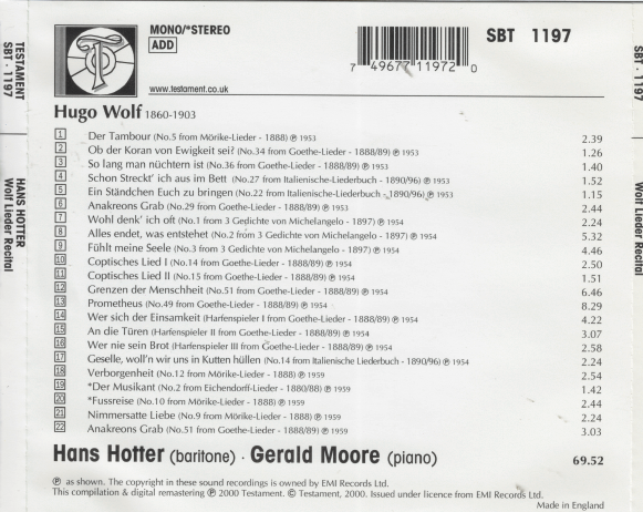HANS HOTTER 'Wolf Lieder Recital/Gerald Moore SBT 1197