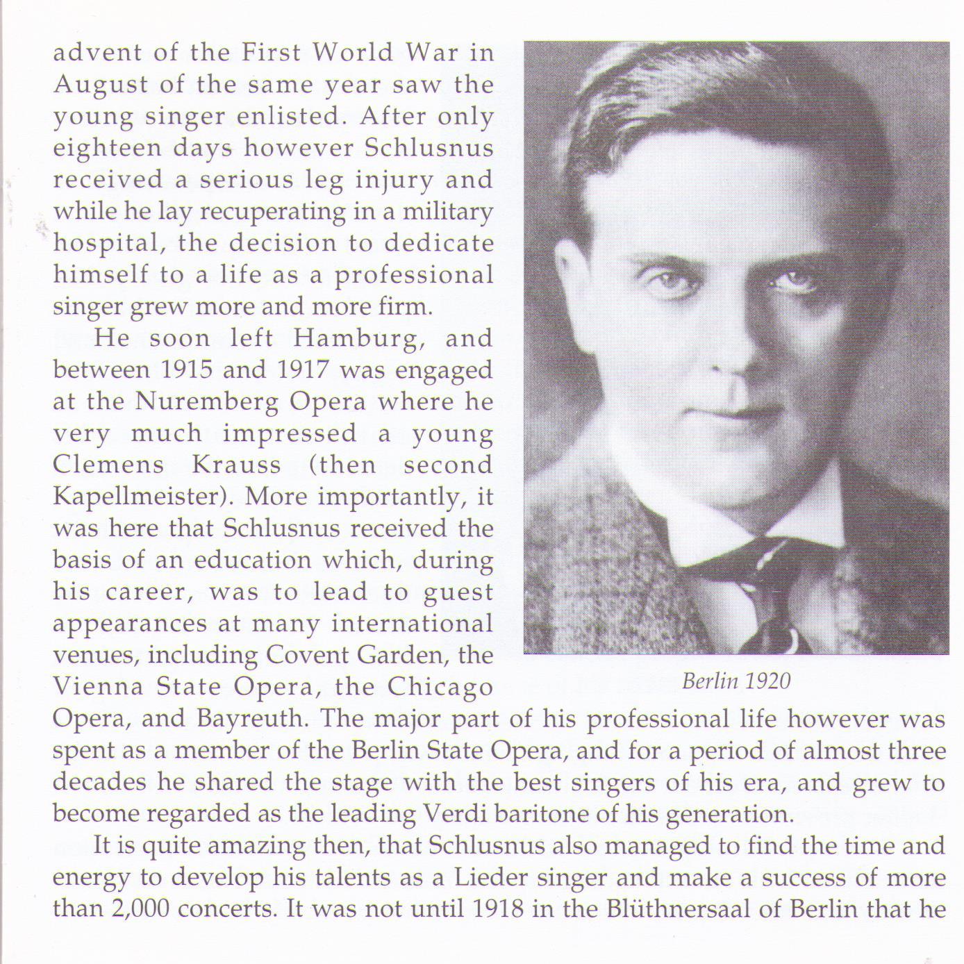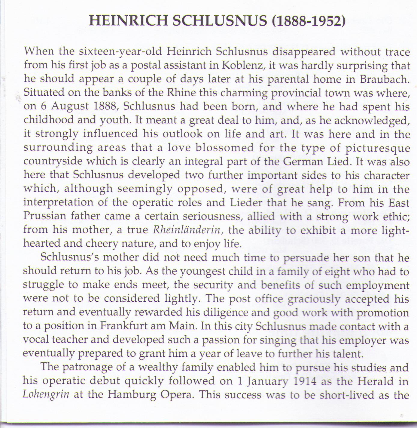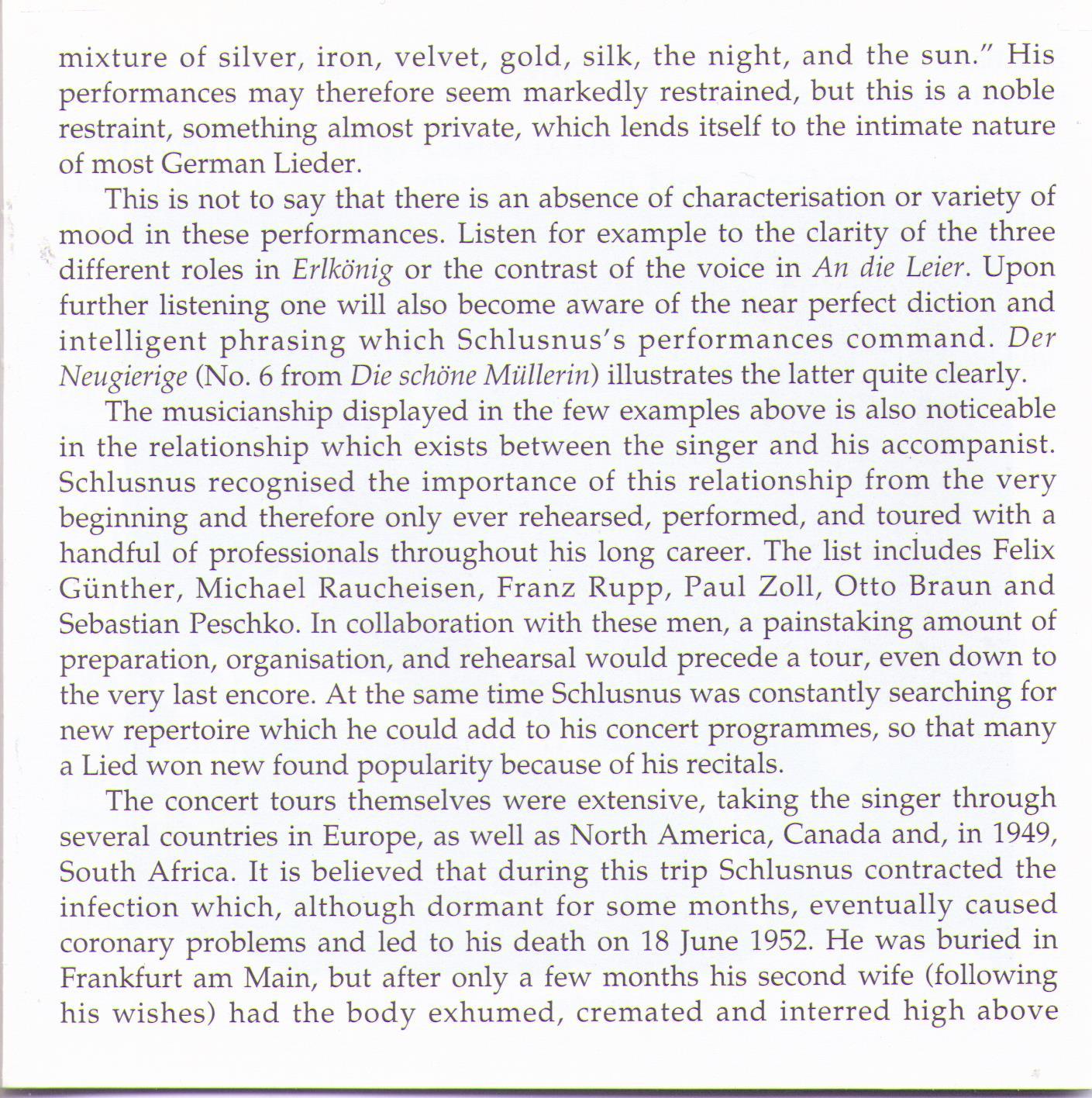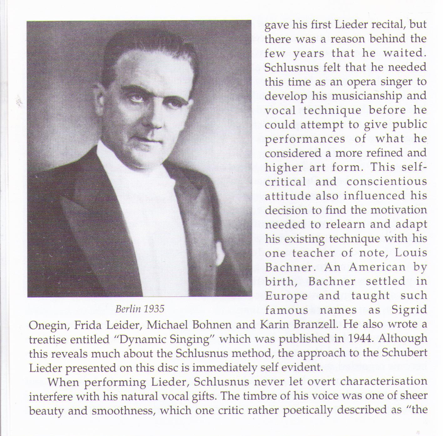 When performing Lieder, Heinrich Schlusnus never let overt characterisation interfere with his natural vocal gifts. The timbre of his voice was one of sheer beauty and smoothness, which one critic rather poetically described as "the mixture of silver, iron, velvet, gold, silk, the night, and the sun."