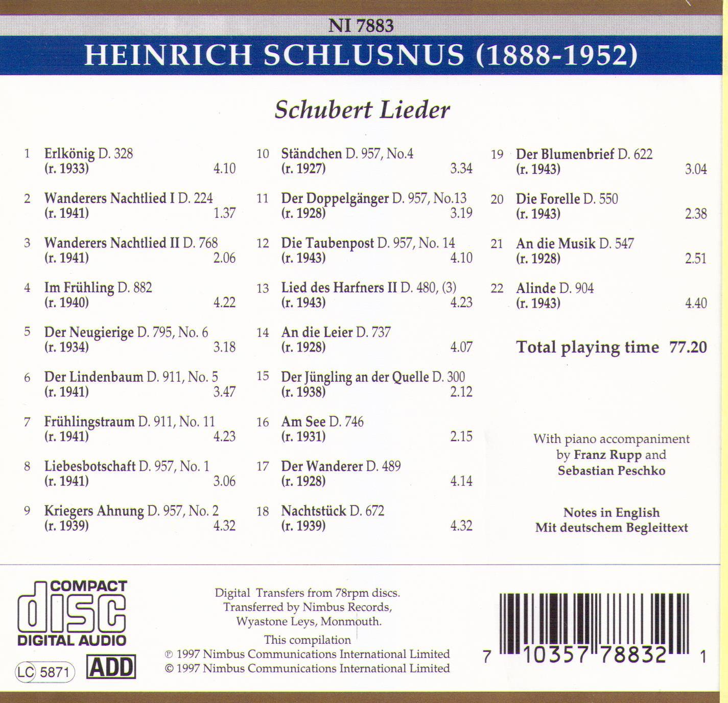 HEINRICH SCHLUSNUS - Schubert Lieder - NI 7883