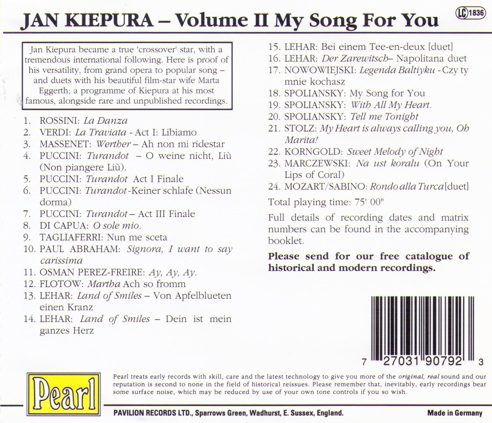 JAN KIEPURA - My Song for You - GEMM CD 9079