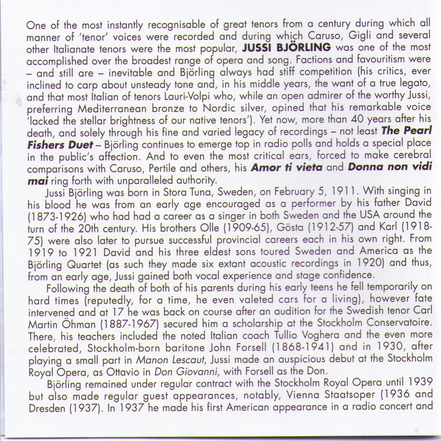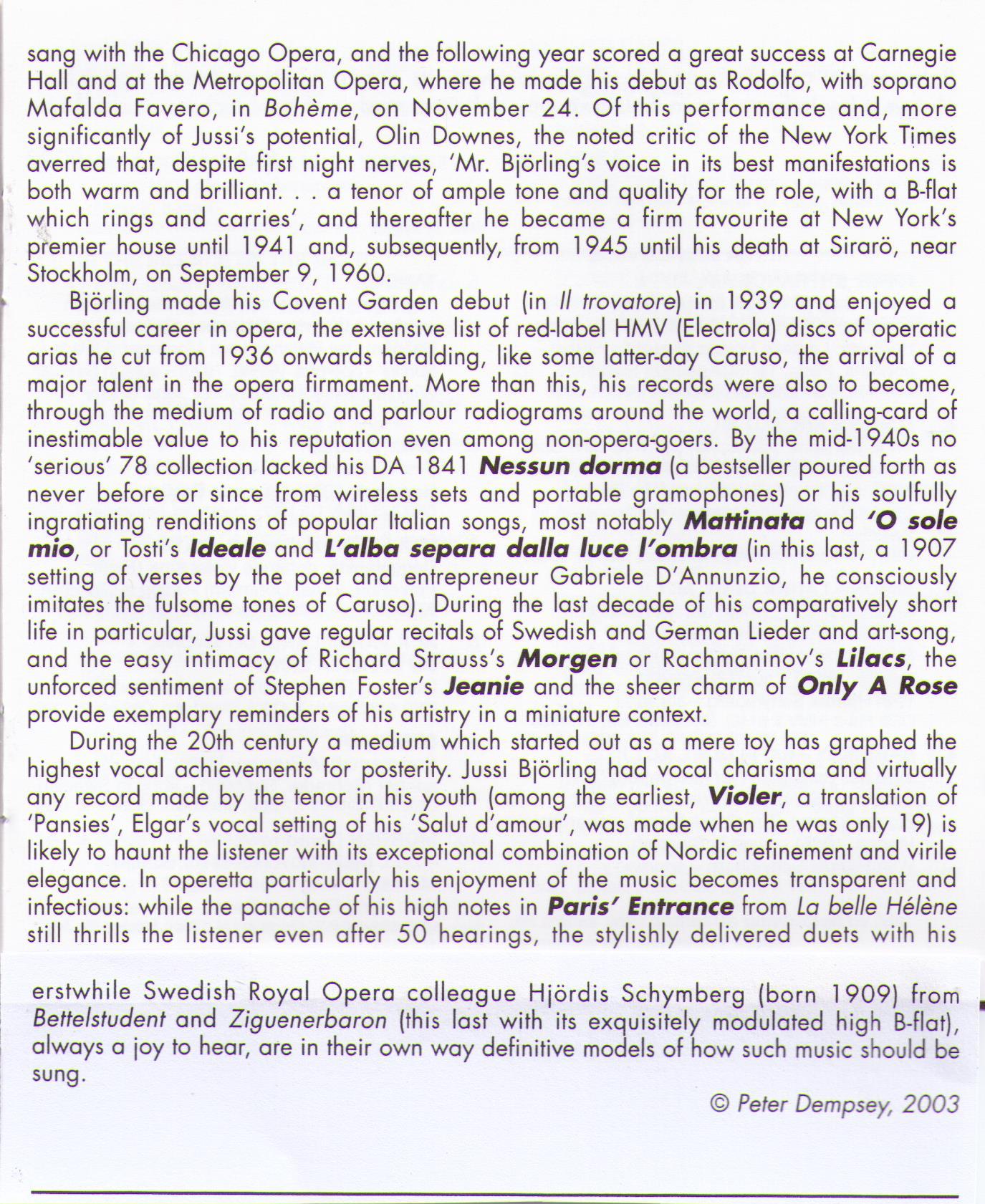 One of the most instantly recognisable of great tenors from a century during which all manner of 'tenor' voices were recorded and during which Caruso, Gigli and several other Italianate tenors were the most popular, JUSSI BJORLING was one of the most accomplished over the broadest range of opera and song.