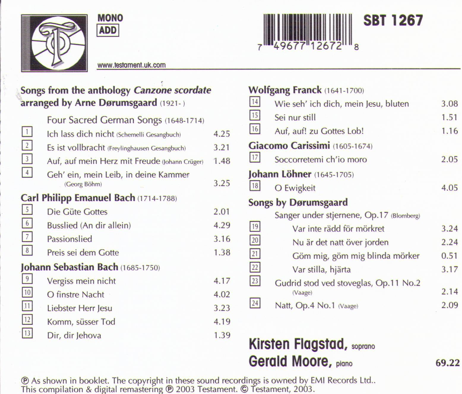 KIRSTEN FLAGSTAD - SBT 1267 "Canzone Scordate" (arranged by Dorumsgaard) CPE Bach- JS Bach- Franck-Carissimi-Lohner Songs by Dorumsgaard with GERALD MOORE