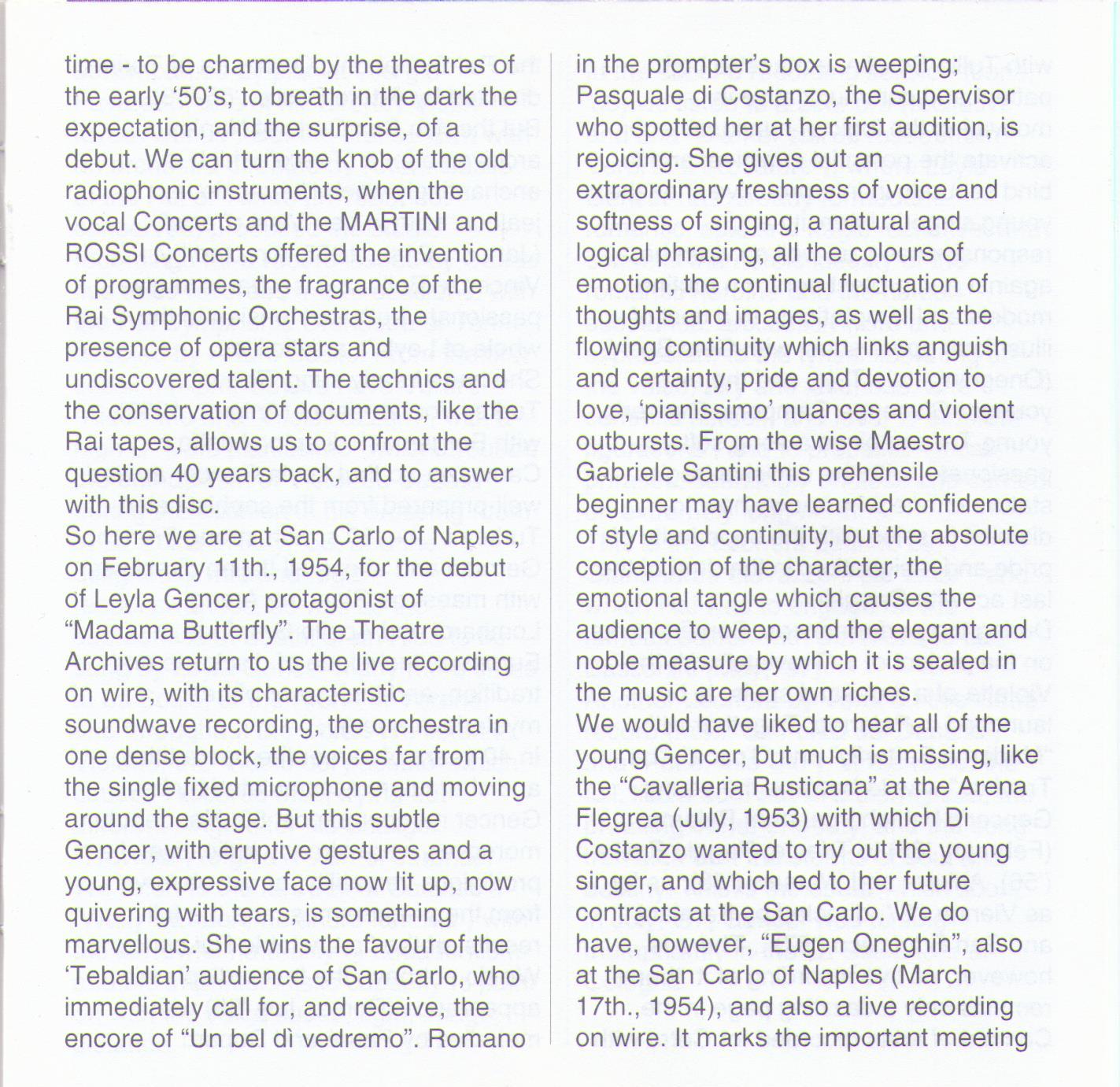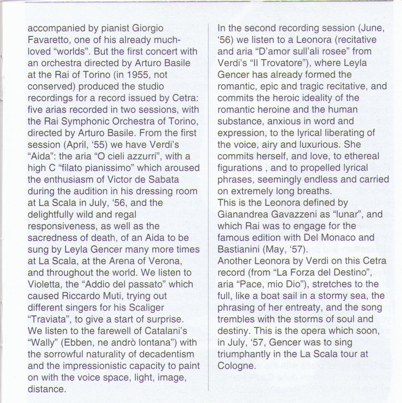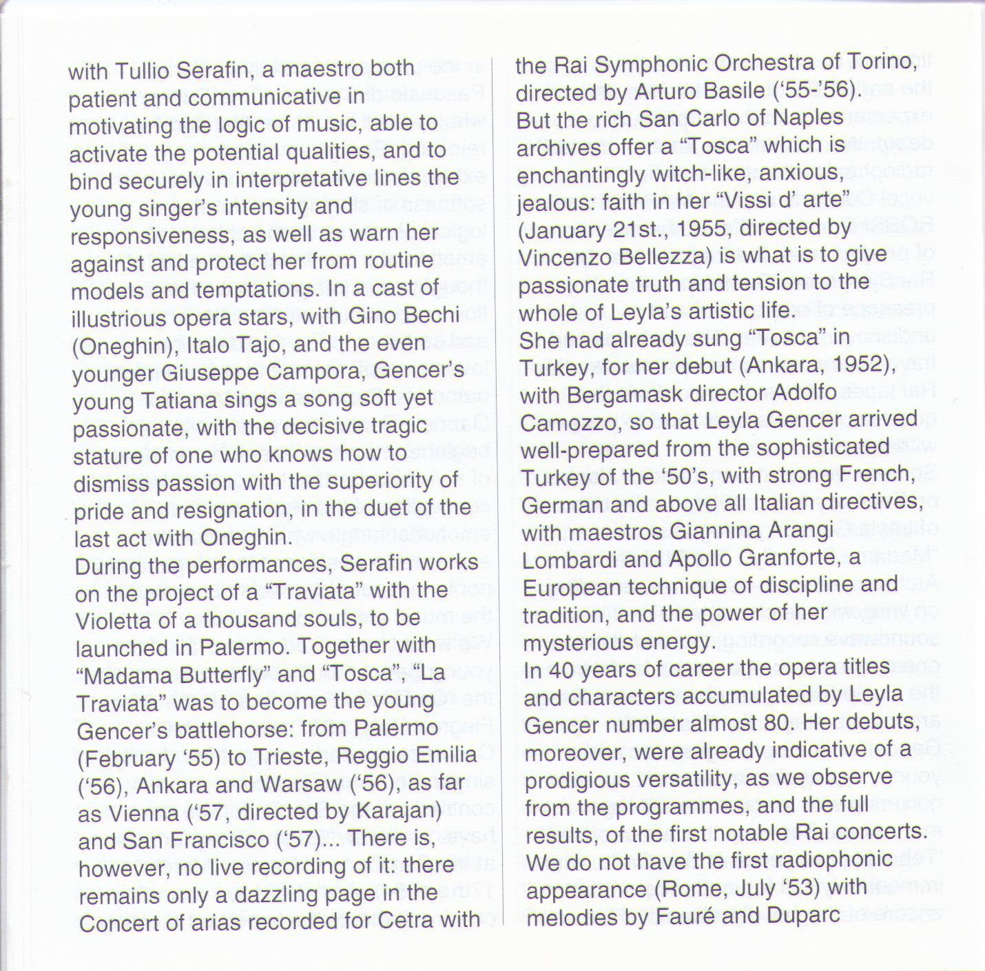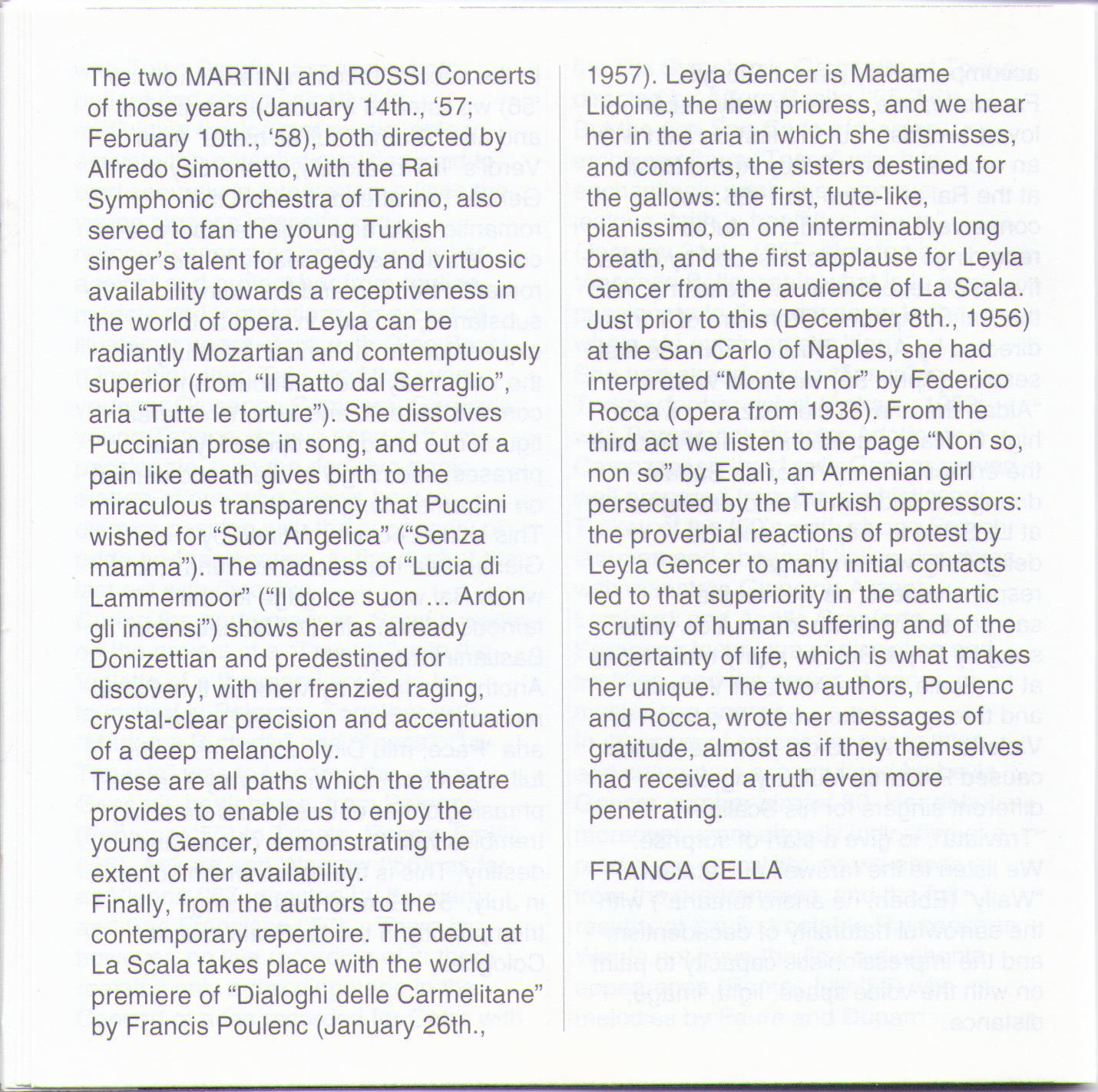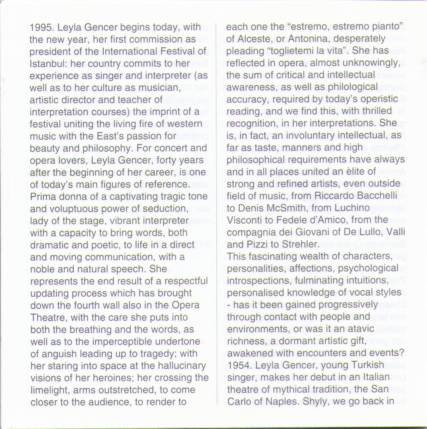 LEYLA GENCER 1954-1957 - 1 MCD 951.122 In a 40-year career the opera titles and characters accumulated by LEYLA GENCER number almost 80. Her debuts, moreover, were already indicative of a prodigious versatility, as we observe from the programmes, and the full results of the first notable RAI concerts.