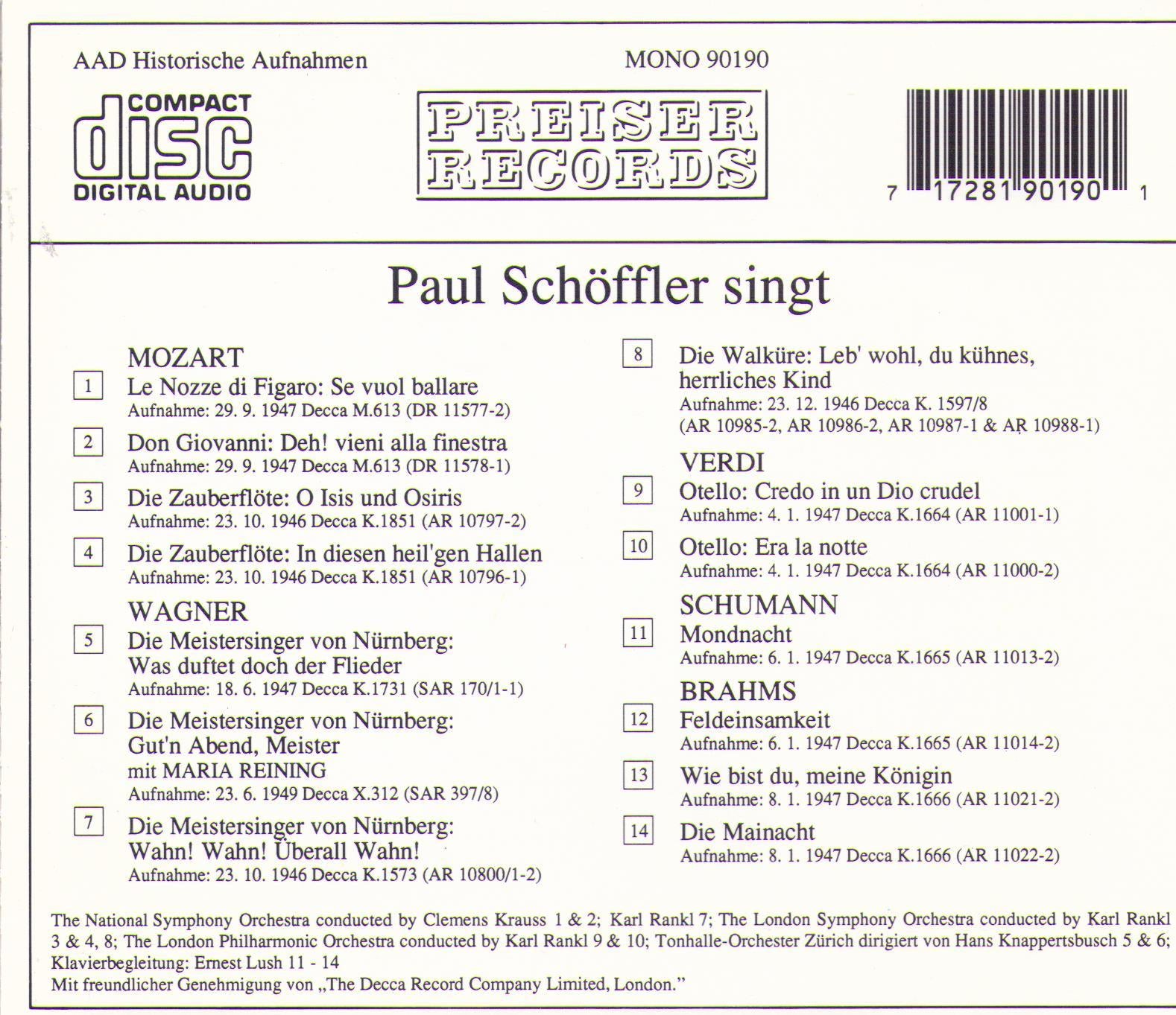 Paul Schoffler - Arien un Szenen - 90190 La Nozze di Figaro (1); Don Giovanni (1); Die Zauberflote (2); Die Meistersinger (3); Die Walkure (1); Otello (2); Schumann (1); Brahms (3).