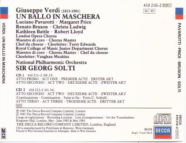 PAVAROTTI 'Un Ballo in Maschera' 410 219-2 (2-cd Set)