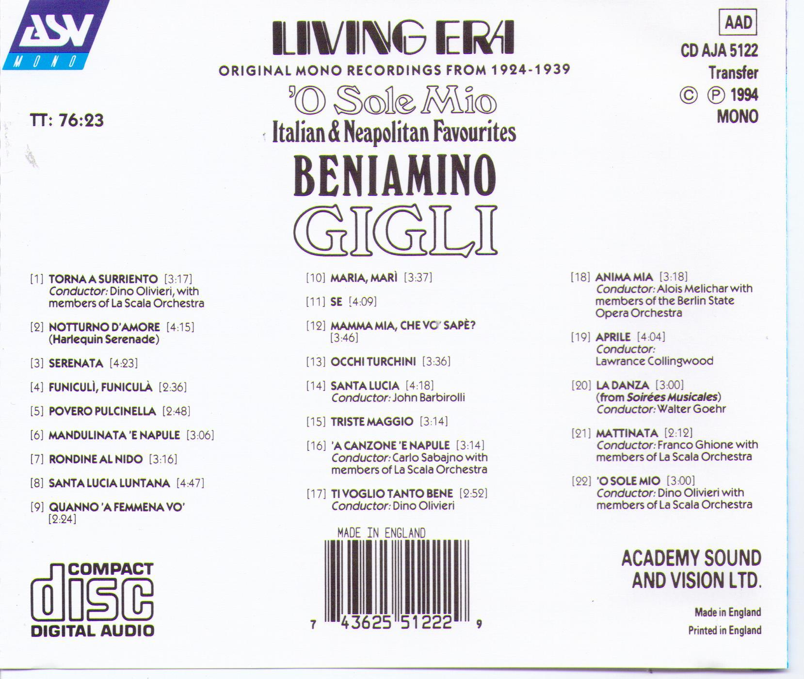 BENIAMINO GIGLI - O Sole Mio - CD AJA 5122 Italian & Neapolitan Favourites GIGLI captivated and conquered the world because he sang light popular repertoire alongside opera, and delivered all "from the heart", in that characteristically honeyed-voice with a warmth which charmed and disarmed all.