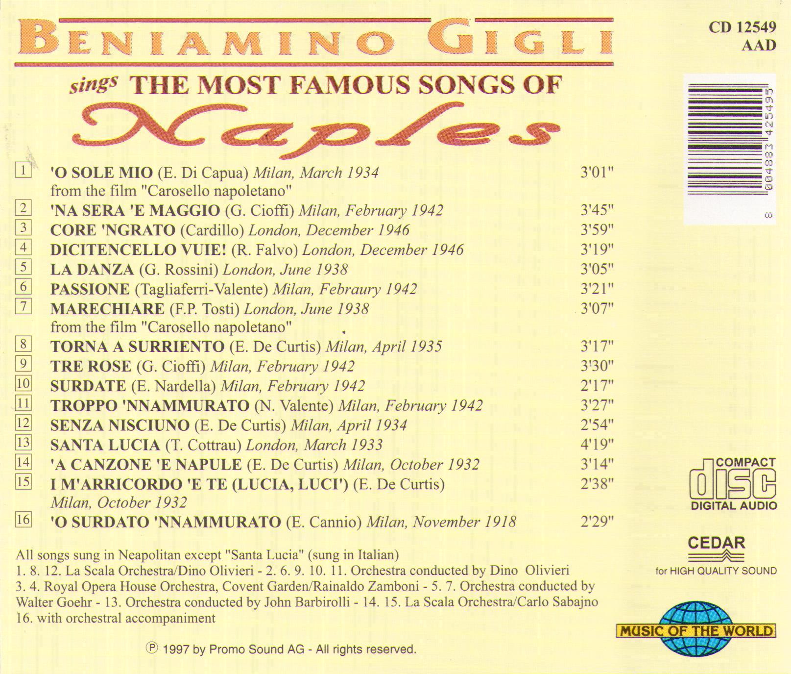 BENIAMINO GIGLI - sings The Most Famous Songs of Naples - CD 12549