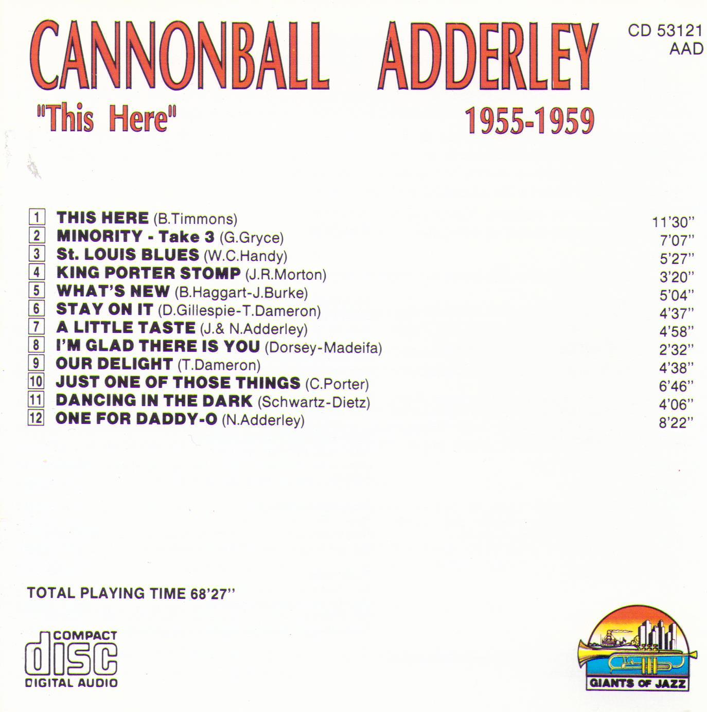 CANNONBALL ADDERLEY - "This Here" - 1955-1959 - CD 53121 with Nat Adderley; Hank Jones; Paul Chambers; Kenny Clarke; Ernie Royal; Bobby Byrne; Jimmy Cleveland; Jerome Richardson; Danny Banks; Junior Mance; Keefer Betts; Specs Wright; Sam Jones; Jimmy Cobb; Miles Davis; Art Blakey; Gil Evans; Johnny Coles; Louis Mucci; Ernie Royal; Milt Jackson and others.