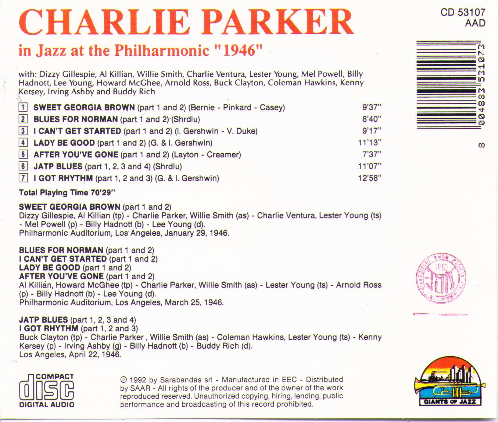 Charlie Parker in Jazz at the Philharmonic "1946" - CD 53107 with Dizzie Gillespie; Al Killian; Willie Smith; Charlie Ventura; Lester Young; Mel Powell; Billy Hadnott; Lee Young; Howard McGhee; Arnold Ross; Buck Clayton; Coleman Hawkins; Kenny Kersey; Irving Ashby and Buddy Rich