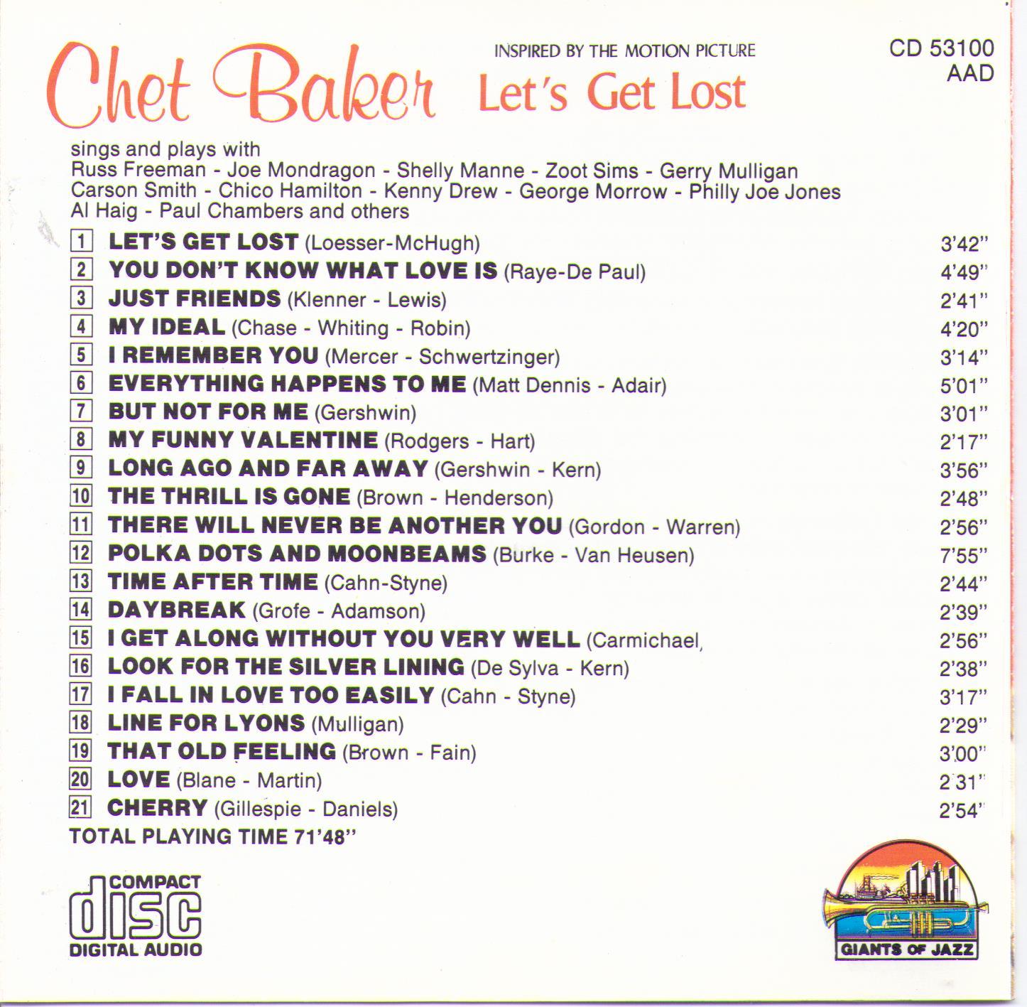 CHET BAKER - Let's Get Lost - 53100 with Ross Freeman; Joe Mondragon; Shelly Manne; Zoot Sims; Gerry Mulligan; Carson Smith; Chico Hamilton; Kenny Drew; George Morrow; Philly Joe Jones; Al Haig; Paul Chambers and others.