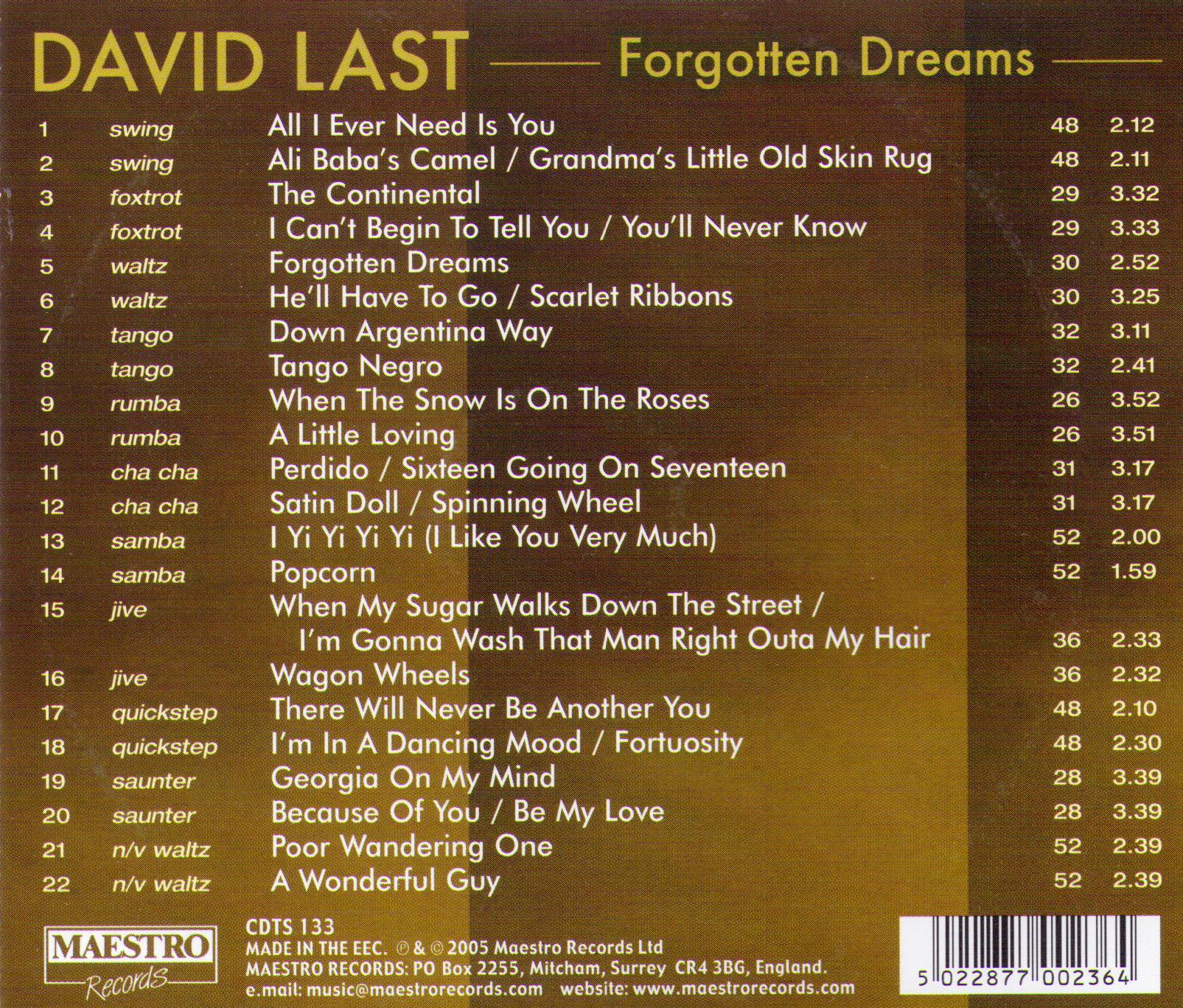 CDTS 133 Another great album from David Last featuring two NEW VOGUE WALTZES at 52 b.p.m. (Tracks 21 & 22) suitable for LUCILLE; SWING WALTZ; TRACEY LEIGH; TWILIGHT; THE PRESIDENT's DAUGHTER's WALTZ; etc.