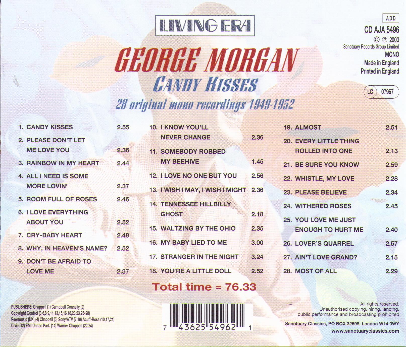 George Morgan was one of Country Music's stalwarts in the late 40s, 50s and 60s. A contemporary of Hank Williams, Red Foley and Eddie Arnold, he is best remembered for his composition CANDY KISSES - and for being the father of Country singer Lorrie Morgan.
