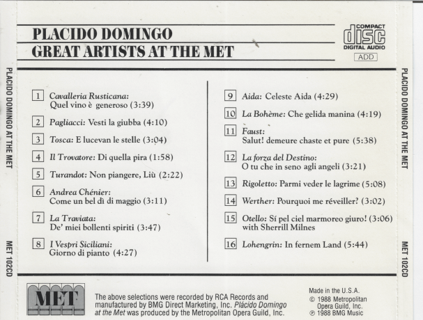 PLCIDO DOMINNGO 'Great Artists At The Met'- MET 102CD