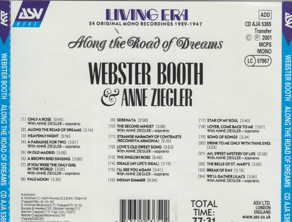 Webstar Booth & Anne Ziegler 'Along The Road Of Dreams' CDAJA 5365